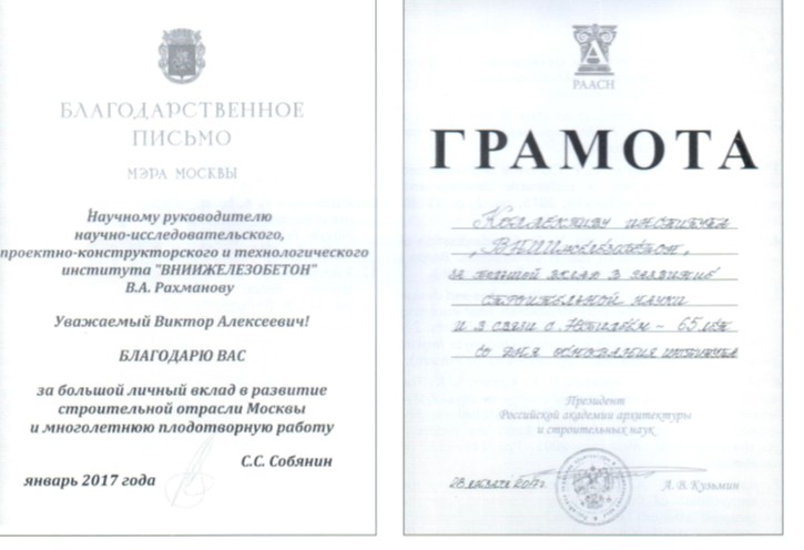 Работа института по внедрению особо легкого полистиролбетона при массовом строительстве энергоэффективных зданий награждена премией Правительства РФ по науке и технике (2009 г.), а также дипломом (2000 г.) и 3-мя медалями (2007 г. -2; 2011 г. - 1) Российской академии архитектурных и строительных наук (РААСН).