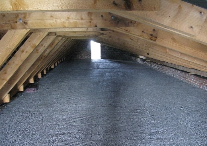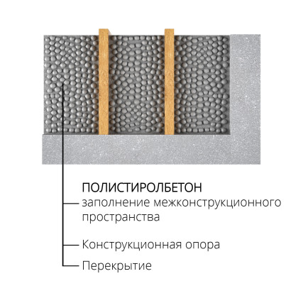 Применяют жидкий раствор полистиролбетонной смеси для изготовления межэтажных облегченных перекрытий, заливки чердаков, реставрации и утепления кровли, а так же для гидро и шумоизоляции пола.